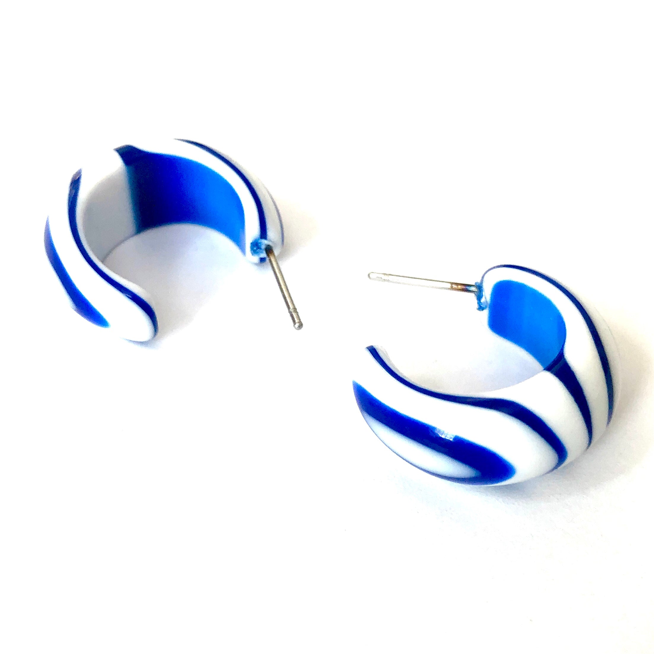 Tap into your inner rockabilly look! I just love the unique marbling pattern on these stripe print hoops. Blue & white lucite striate in a geometric marbled pattern. Each hoop measures approximately 1" or 24mm in diameter and these are thick, about 12mm +/-.