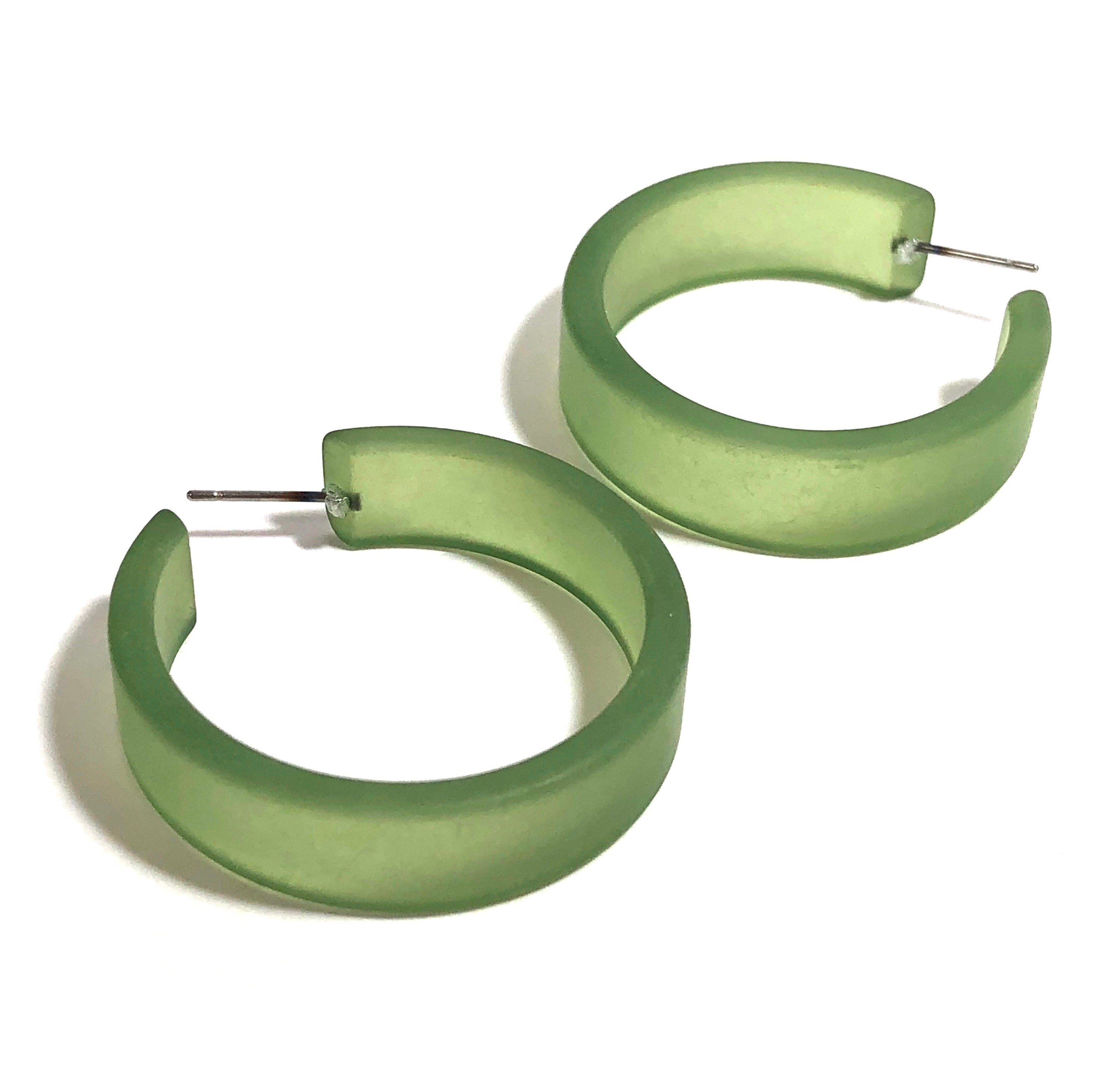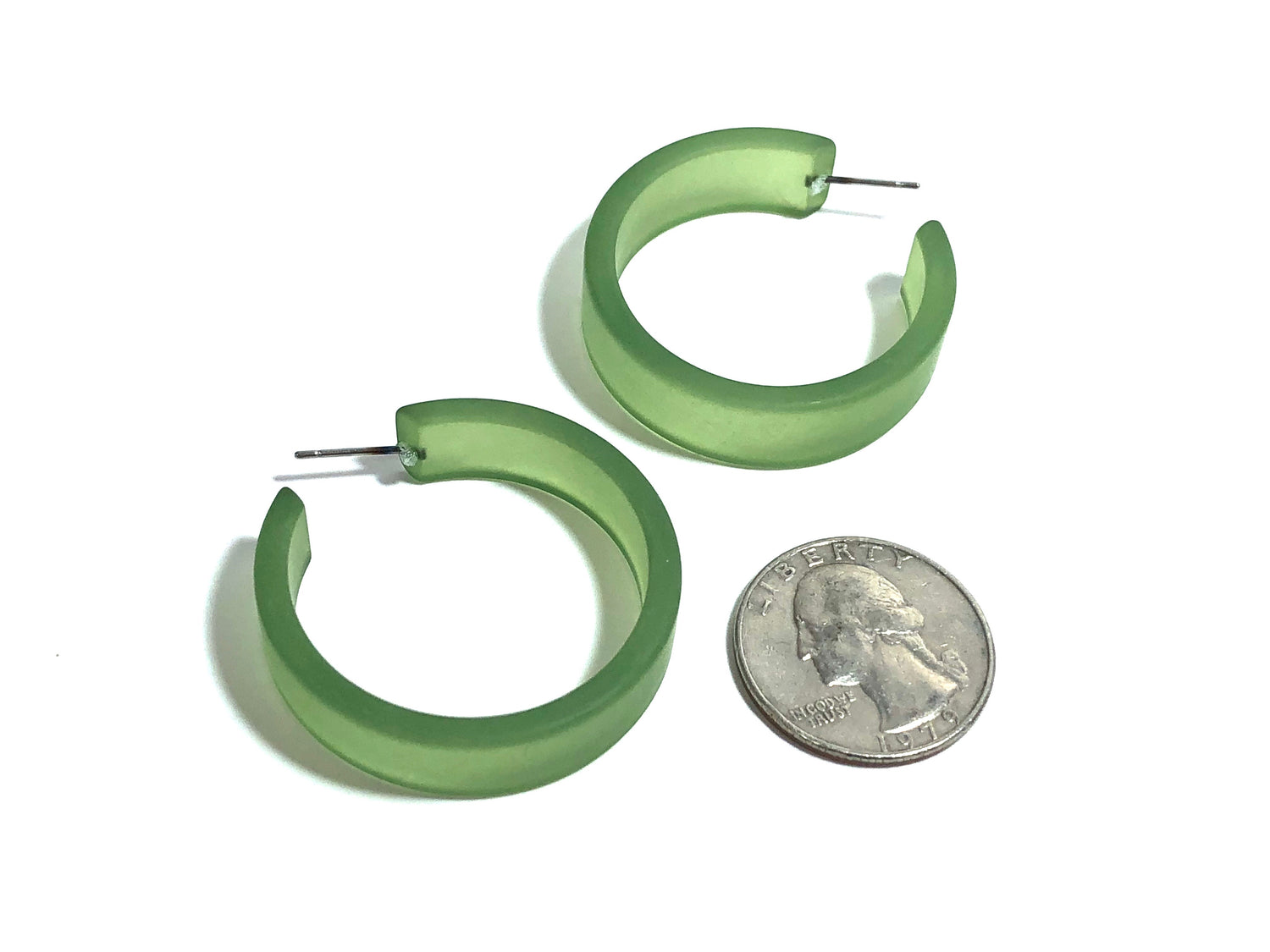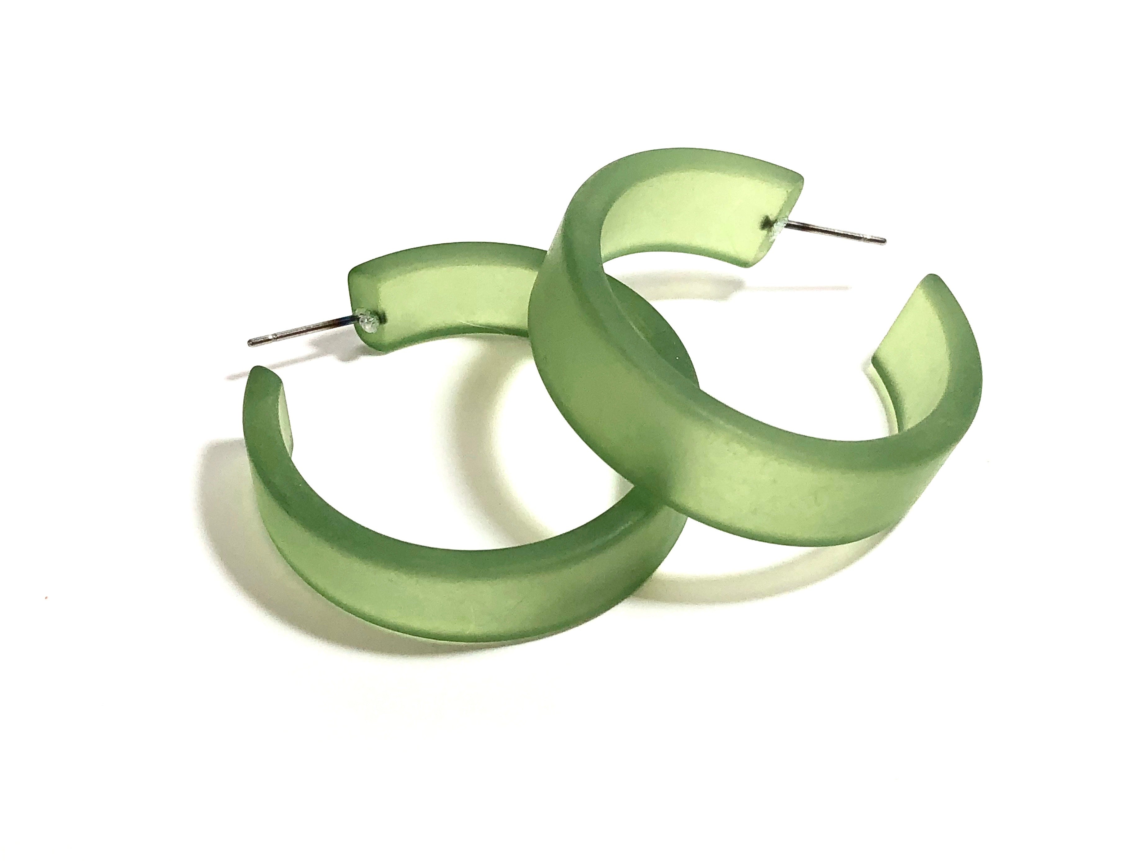 The Portland Hoop Earrings measure approximately 36mm and 10mm in width in diameter and width, respectively. This style, named after Portland, Maine – the maker's hometown – is one of our largest, yet it is still remarkably lightweight and comfortable to wear. These earrings come in lots of color options & a frosted finish. They are crafted and finished in the US, using vintage lucite parts from the 1960s-1980s from renowned manufacturers such as Best Plastics and Coro, Avon, and Haskell. The posts and backings of the earrings are made of sturdy surgical steel and acrylic.