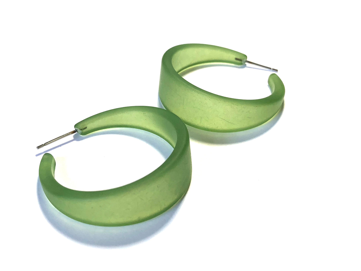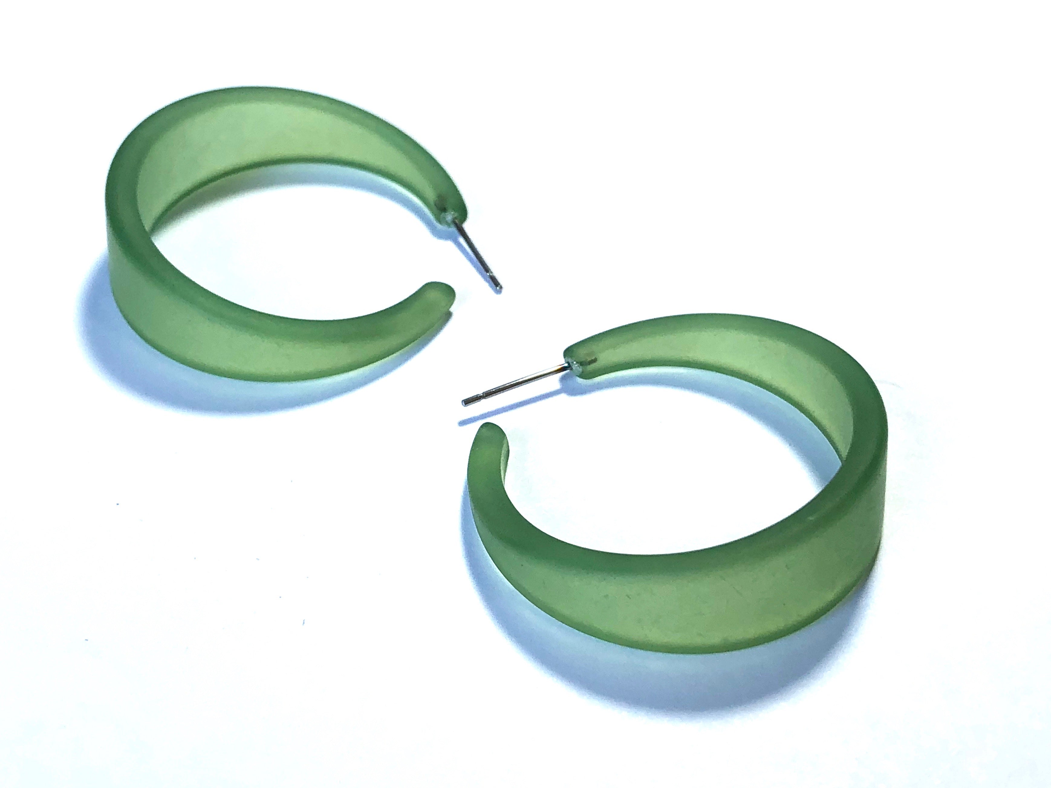 These hoop earrings made of vintage lucite in a frosted finish. The Emily Hoop is one of our most popular and largest styles. It's bold & lightweight, a great statement hoop earring. Each measures 1.5" in diameter and about 1/2" at the widest. This style comes in lots of other luscious colors. Be sure to check out the rest of the earrings in the shop for other color options in this same style.