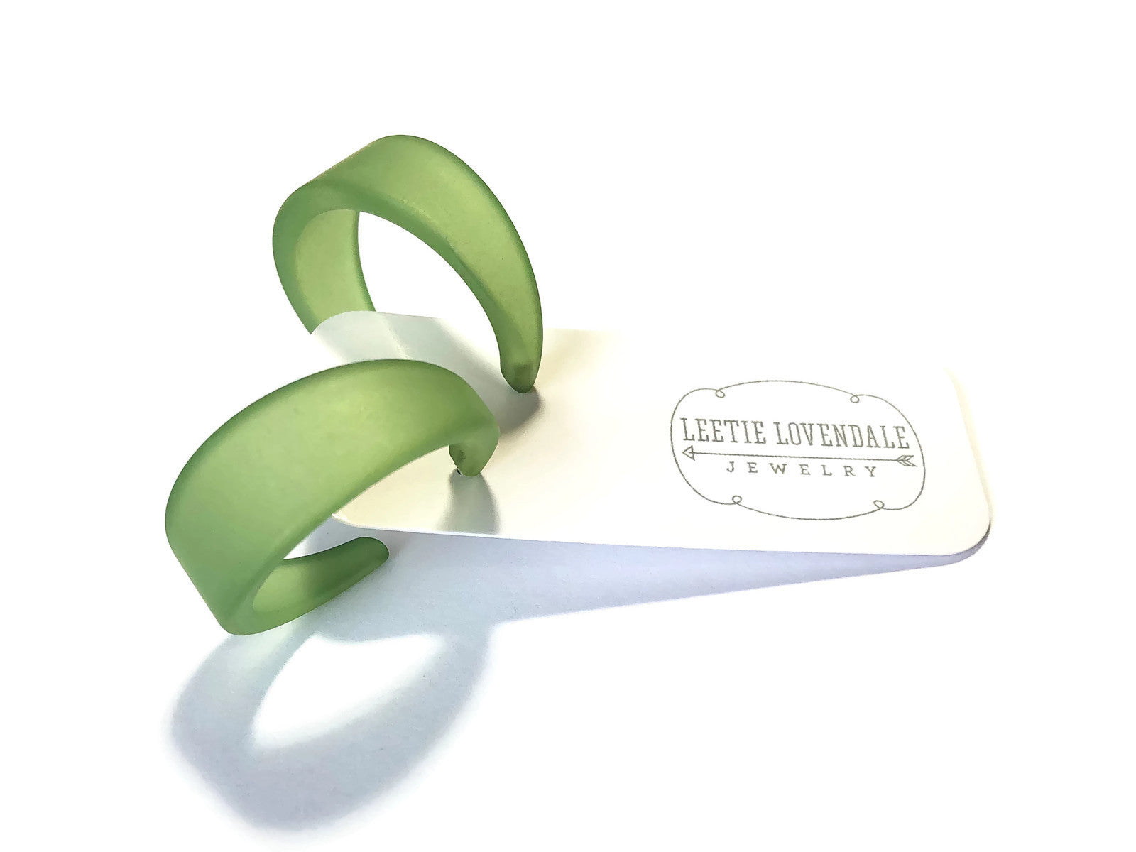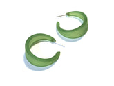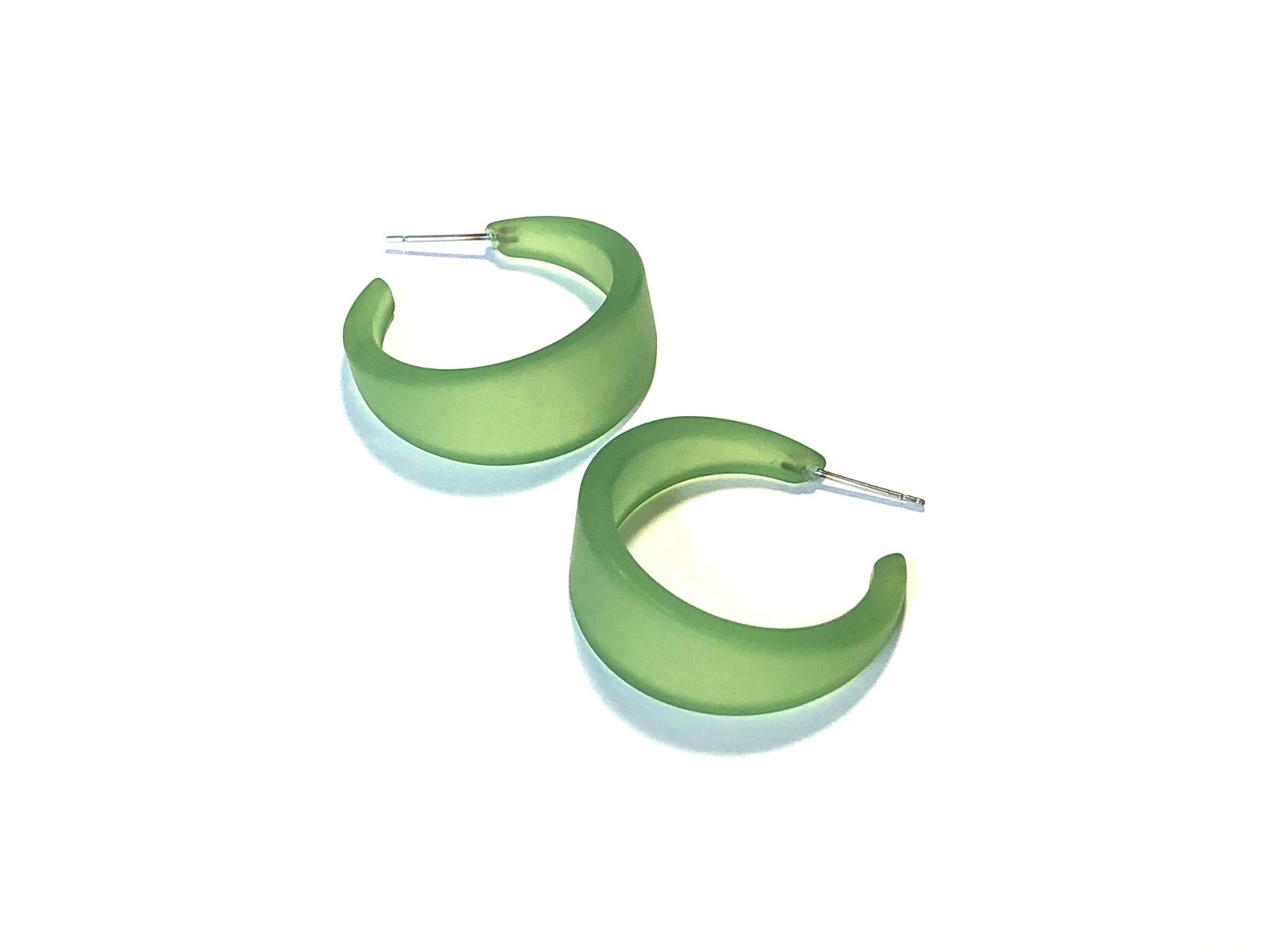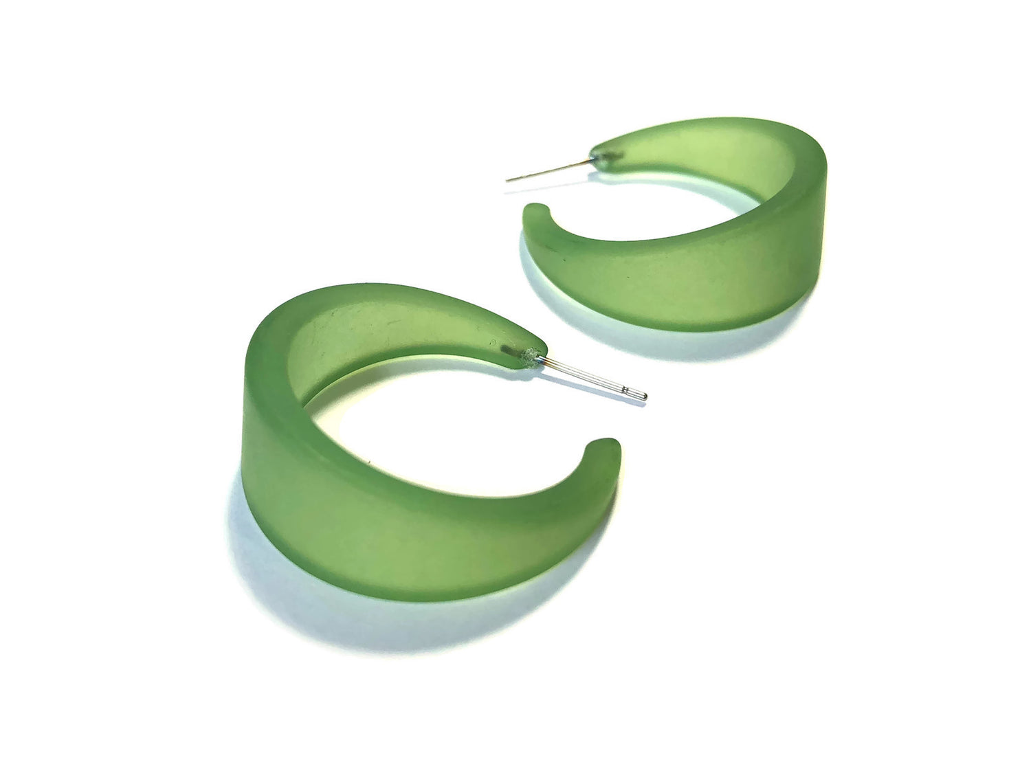 Hoop earrings in the larger size of the Marilyn style hoop, a modern style hoop with a frosted finish. The Marilyn Hoop is a tapering or waning shape that starts & ends at a point and widens in the middle. The large version of the Marilyn Hoop measures 1.25" or 30mm in diameter and 12mm in width. The model is wearing the larger sized Marilyn Hoop in the Frosted Black color to give you an idea of the size and scale & what it will look like when you rock them!
