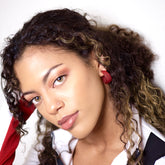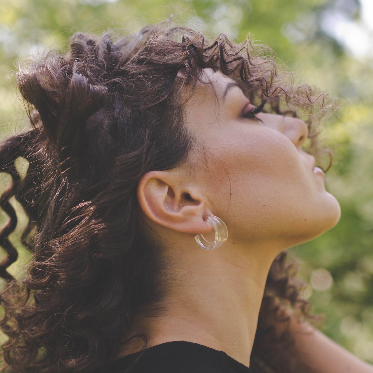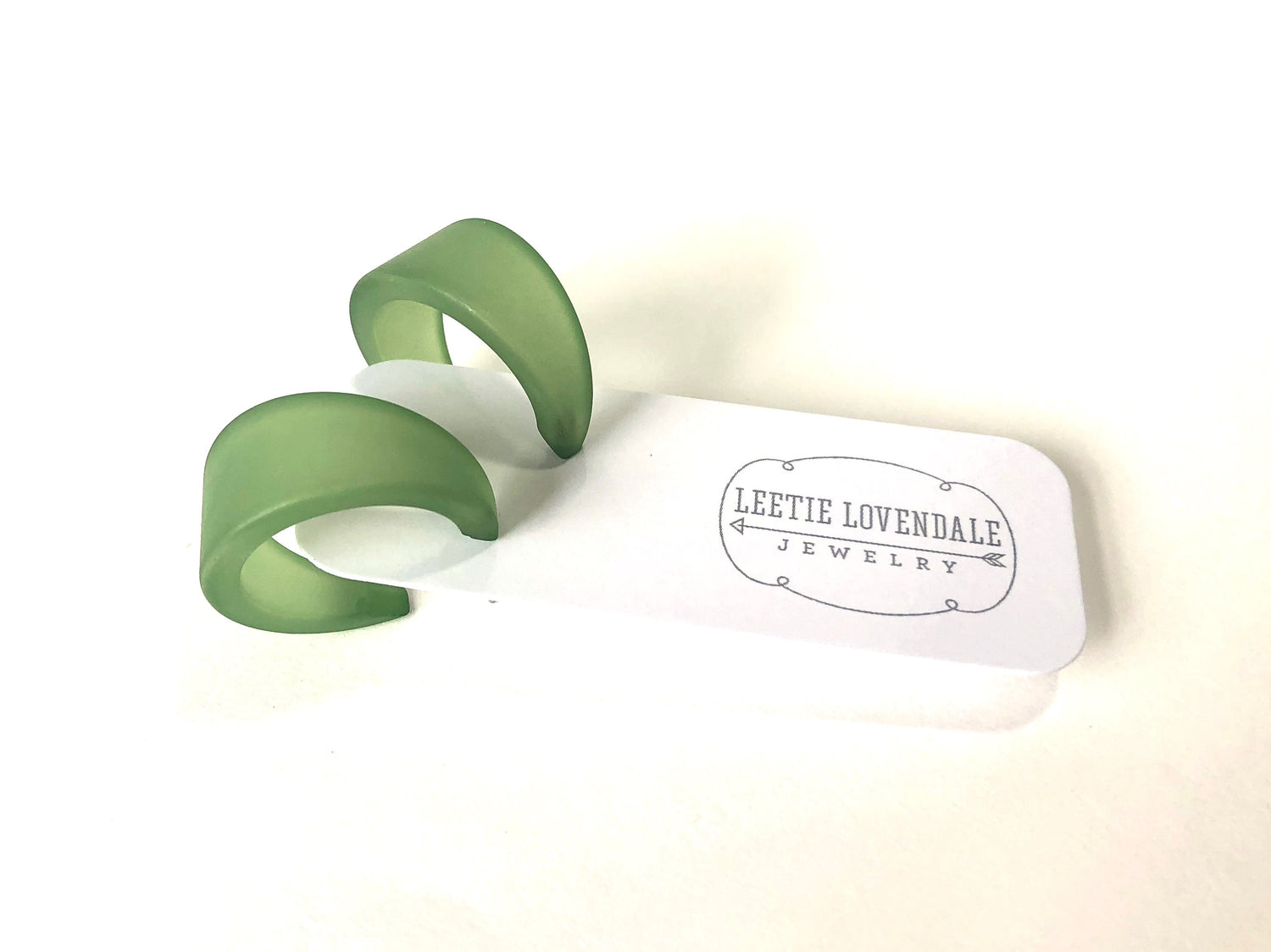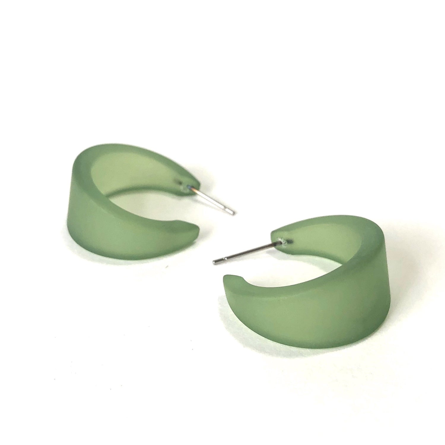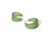Hoop earrings in the small size of the Marilyn style hoop, a modern style hoop with a frosted finish. The Marilyn Hoop is a tapering or waning shape that starts & ends at a point and widens in the middle. The small version of the Marilyn Hoop measures 1" or 24mm in diameter and 14mm in width. Check out the last pic of the model wearing this size & style in the Clear and Red to get an idea of what they'll look like when you rock them!