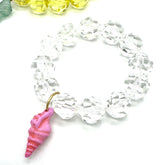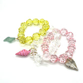 Faceted lucite offers up a lot of sparkle without the weight! Vintage lucite beads and charms have been upcycled into these sweet pastel bracelets, just ready and waiting for your next beach outing. Each bracelet is strung on durable stretch cord and available in two sizes for a comfy fit, whether you prefer a standard snug or queen-sized drape.