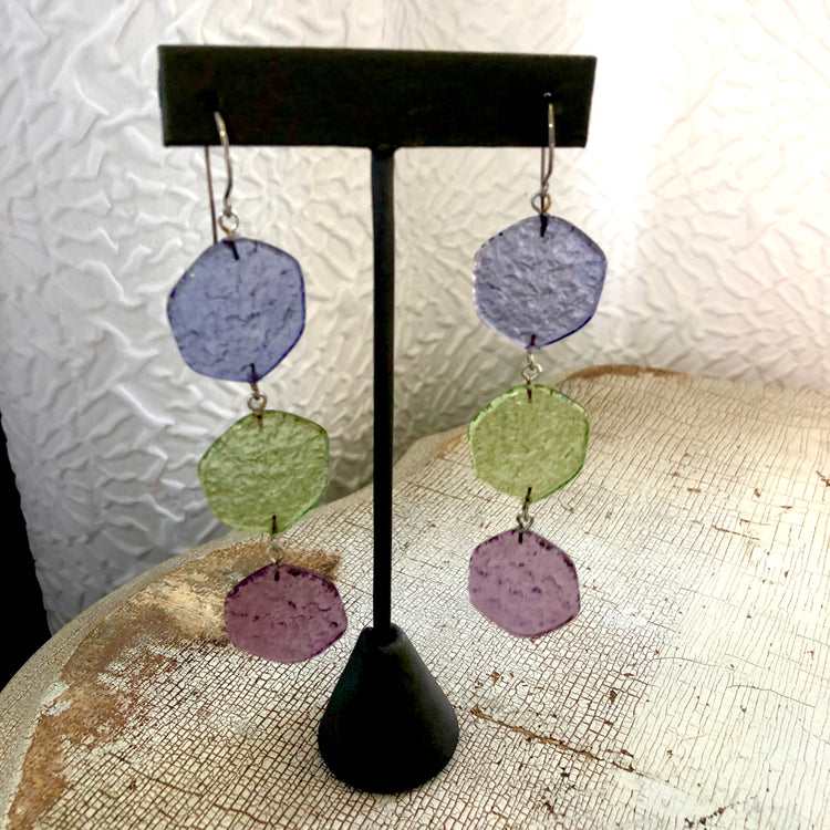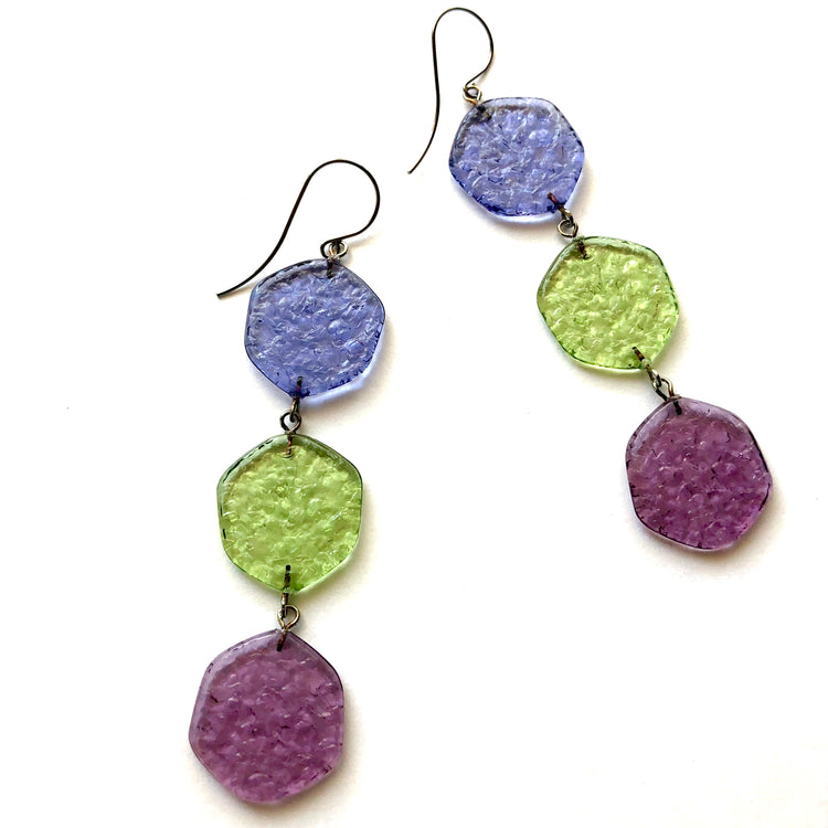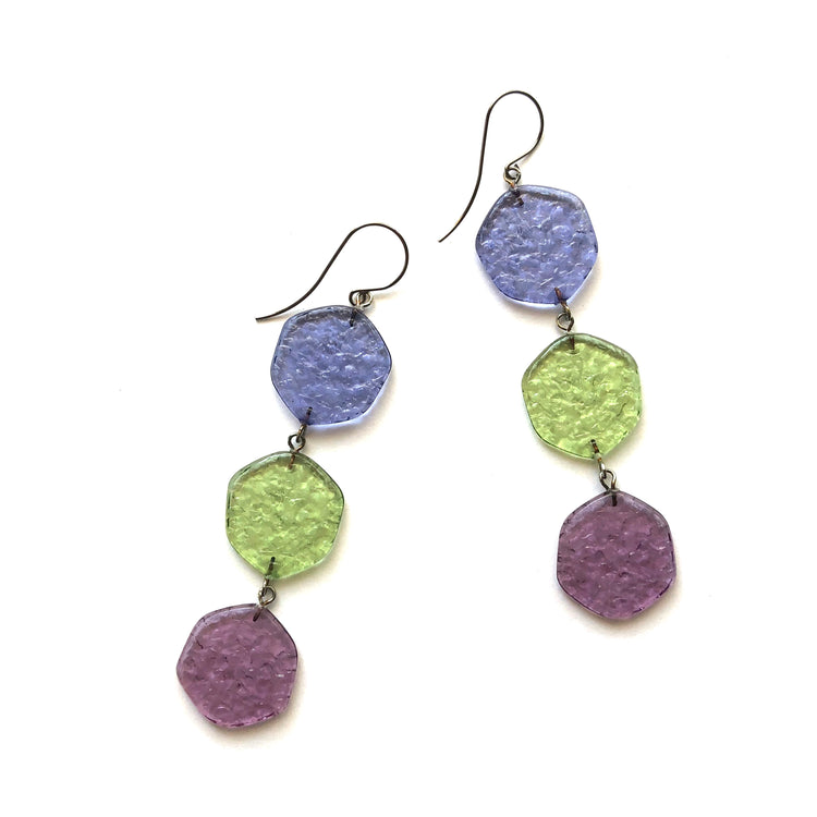 'Stained Glass' drop earrings in a great size & a transparent finish. These fun statement earrings are triple-linked and bold & the texture mimics stained glass windows in cathedrals even though it is made of light-weight vintage lucite.