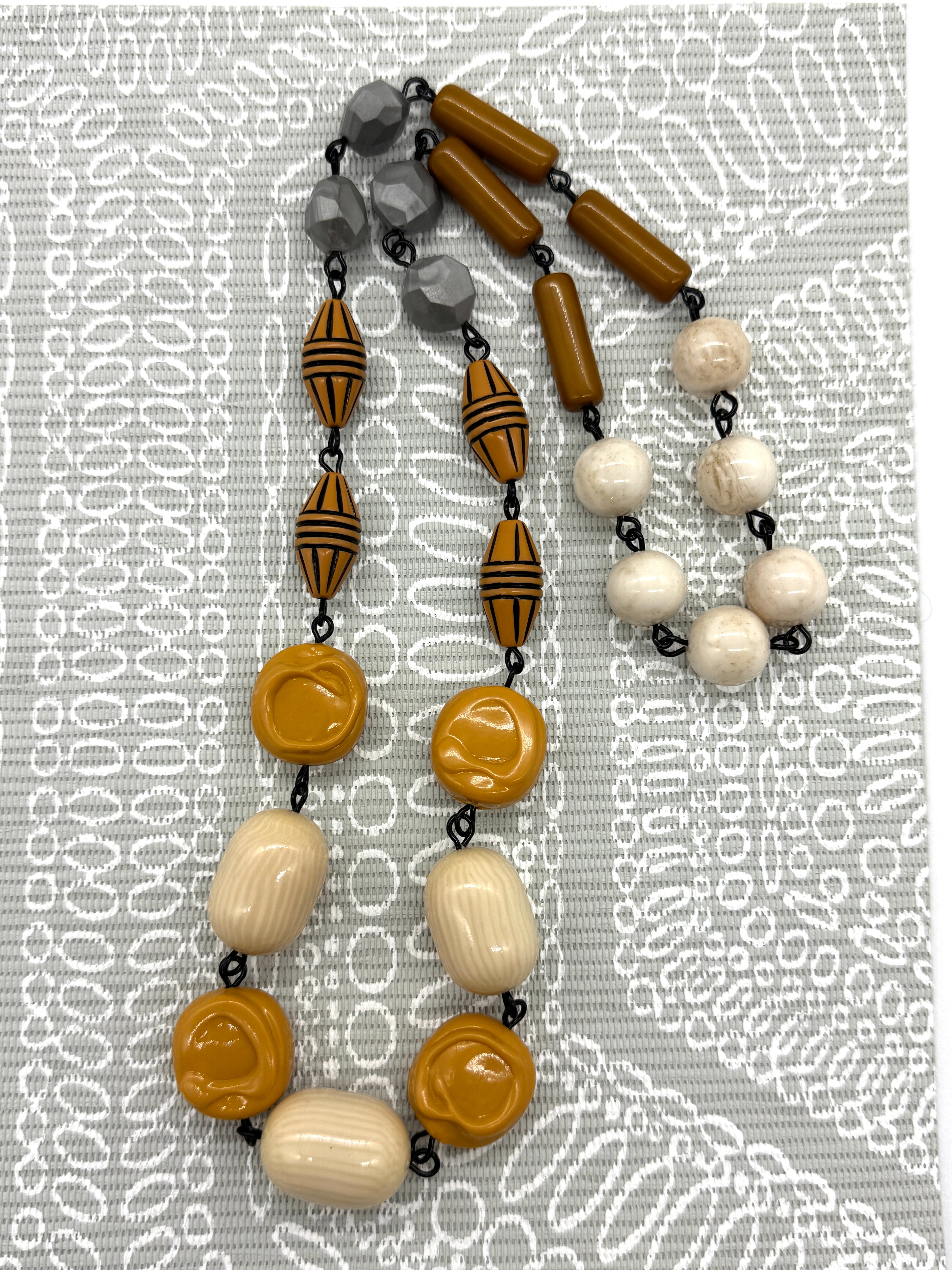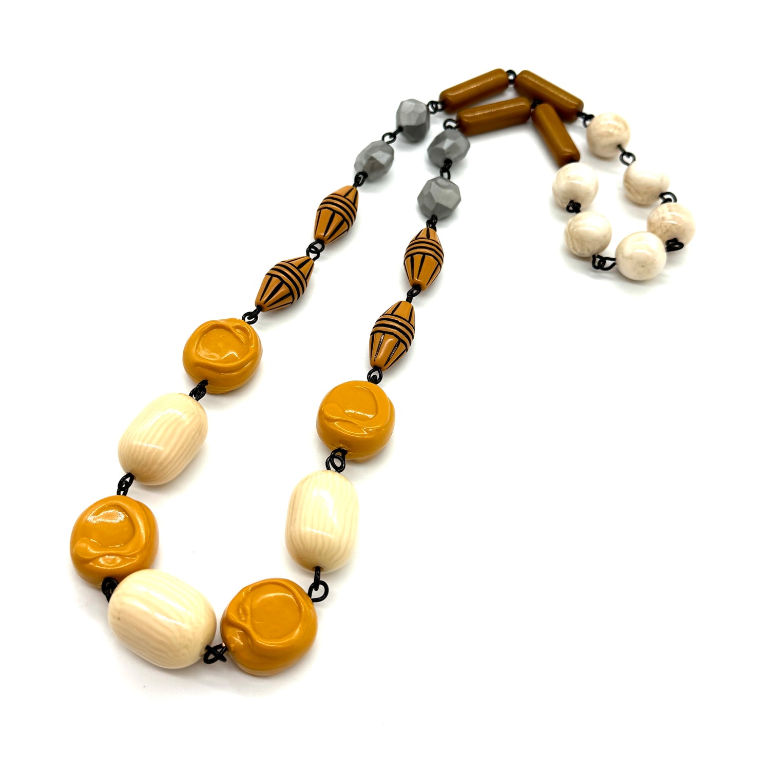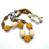 The Sun-Baked Stripe Carmen Necklace is a wearable ode to retro kitchens, sunlit pottery studios, and mid-century color palettes. Featuring a perfectly mismatched lineup of golden yellow swirls, creamy vanilla ridges, cocoa-striped beads, soft greys, and glazed ivory rounds — each bead is vintage and full of character. Hand-wired on blackened brass for contrast, this necklace brings sunshine and nostalgia in equal measure.