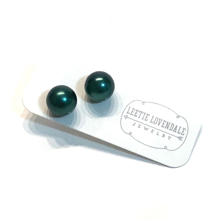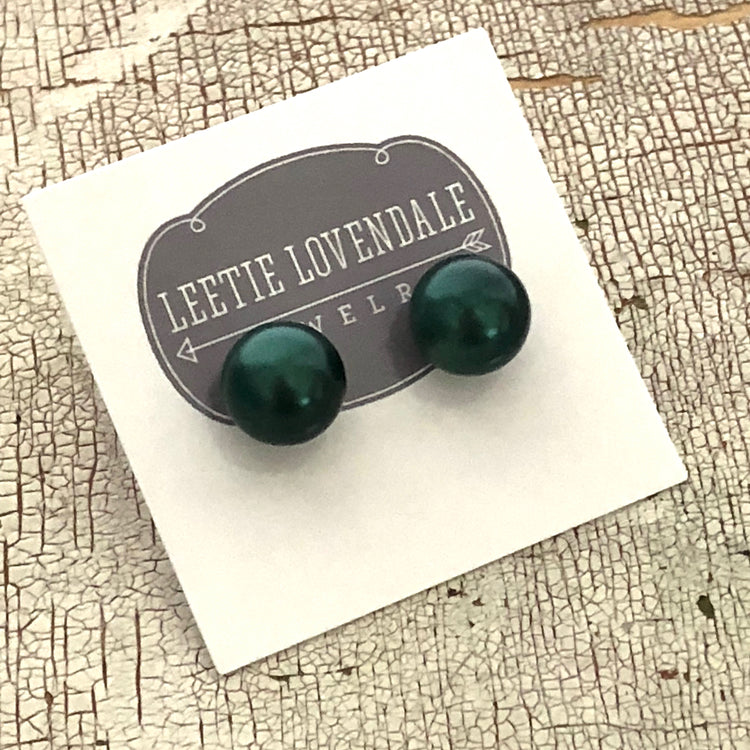 Green black pearl coated lucite studs with a teal hue. Almost metallic pearlized lucite bead shaped post earring. Each measures about 12mm or just under 1/2" in diameter. A very metallic or pearl-like quality, these are fantastic. Check out the pic with the model who is sporting the same style & size, in a different color. This way you can get an idea of the size & scale when you wear them!