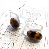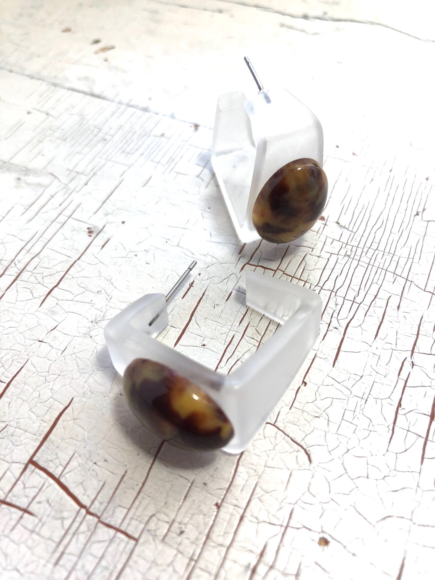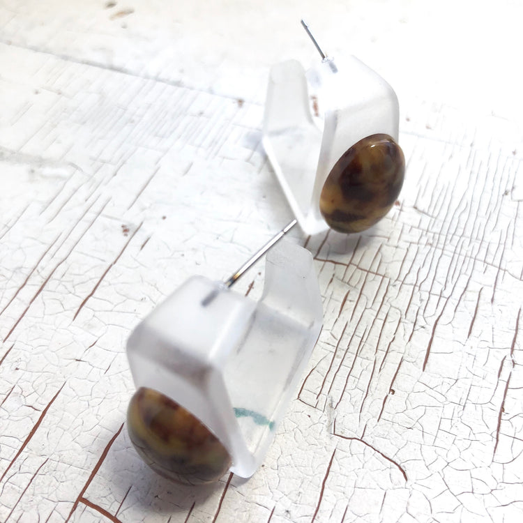 Earrings are made with vintage lucite parts that were made in Rhode Island in the 1960's - early 80's by Best Plastics. We hand-set them with surgical steel earring posts and they have sturdy surgical steel/acrylic backings on them as well. Light-weight & fun to wear.