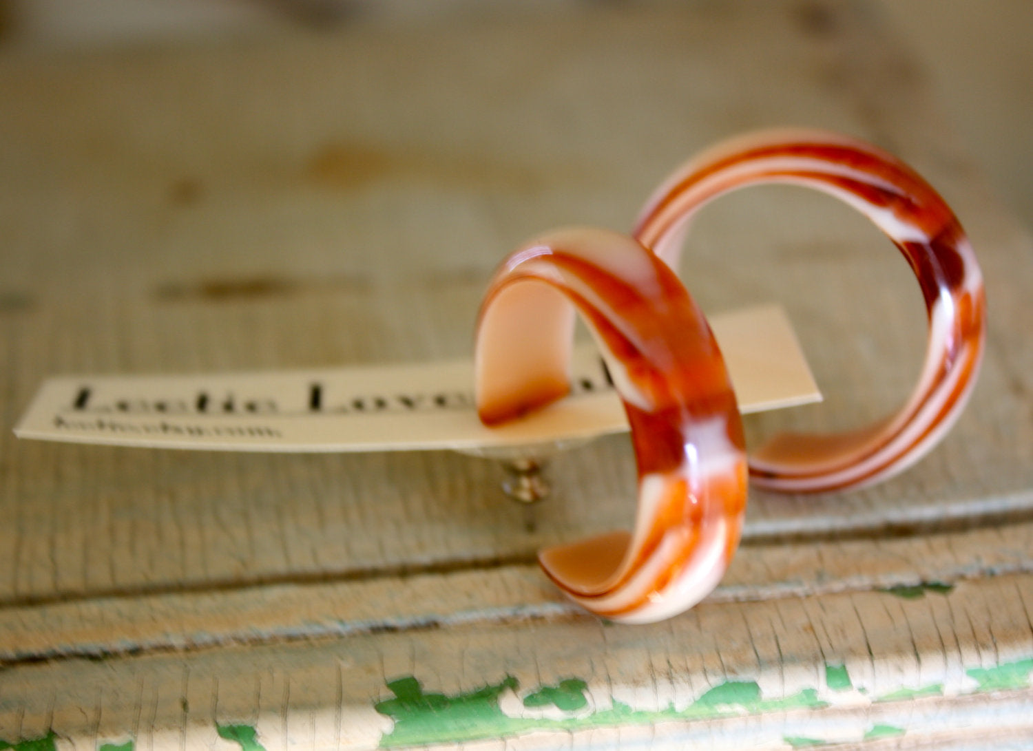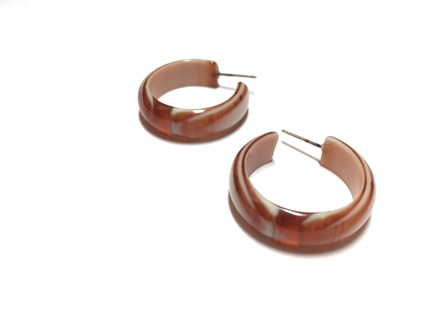 Marbled lucite hoop earrings measuring just about 1.25" or 29mm in diameter and 9mm in width. Each earring will vary in design as the agate pattern shows the varied plastic when it was cut from its drawn cane when the components were made. Check out the last pic where you can see the look & feel of this style on a model.