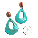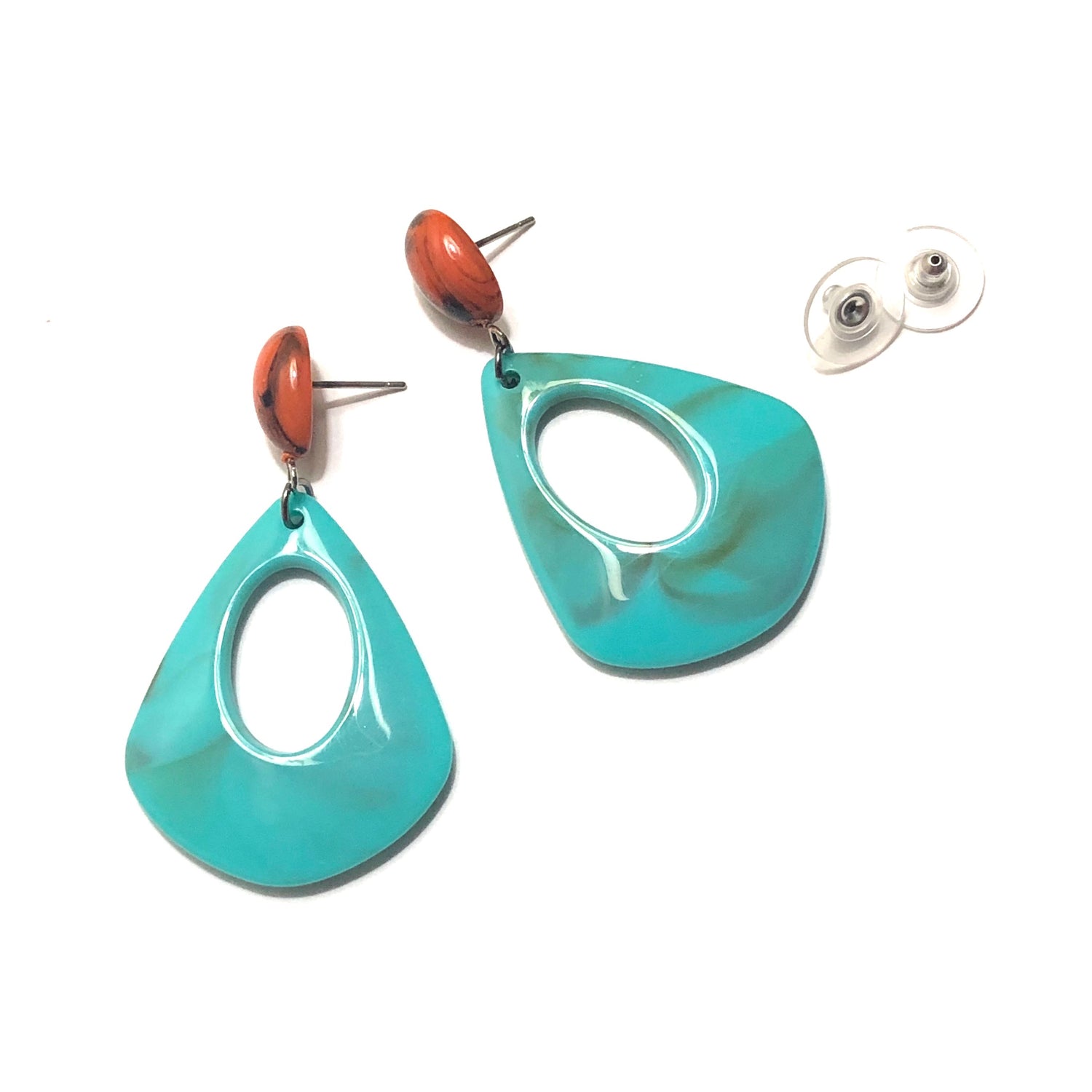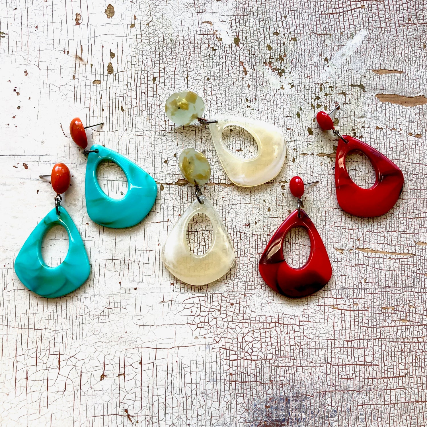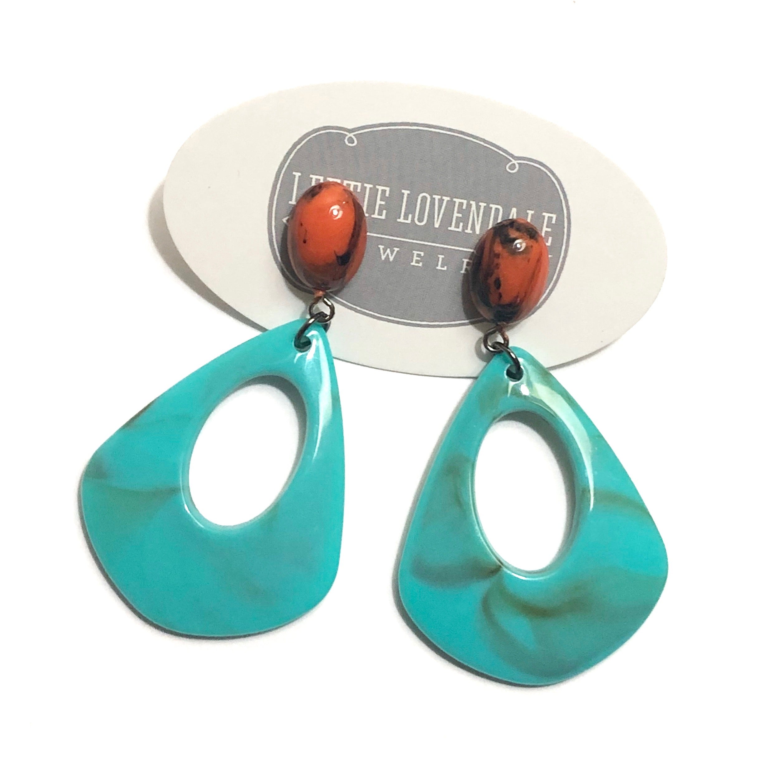 Marbled acrylic teardrop donut drops meet vintage lucite studs. The Mimi earrings are so light-weight but they're a great noticeable size. One of the few styles in the collection that uses contemporary parts, we make these here in the US with surgical steel posts. These are a great bold size, measuring just over 2.25" in length from end to end.