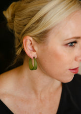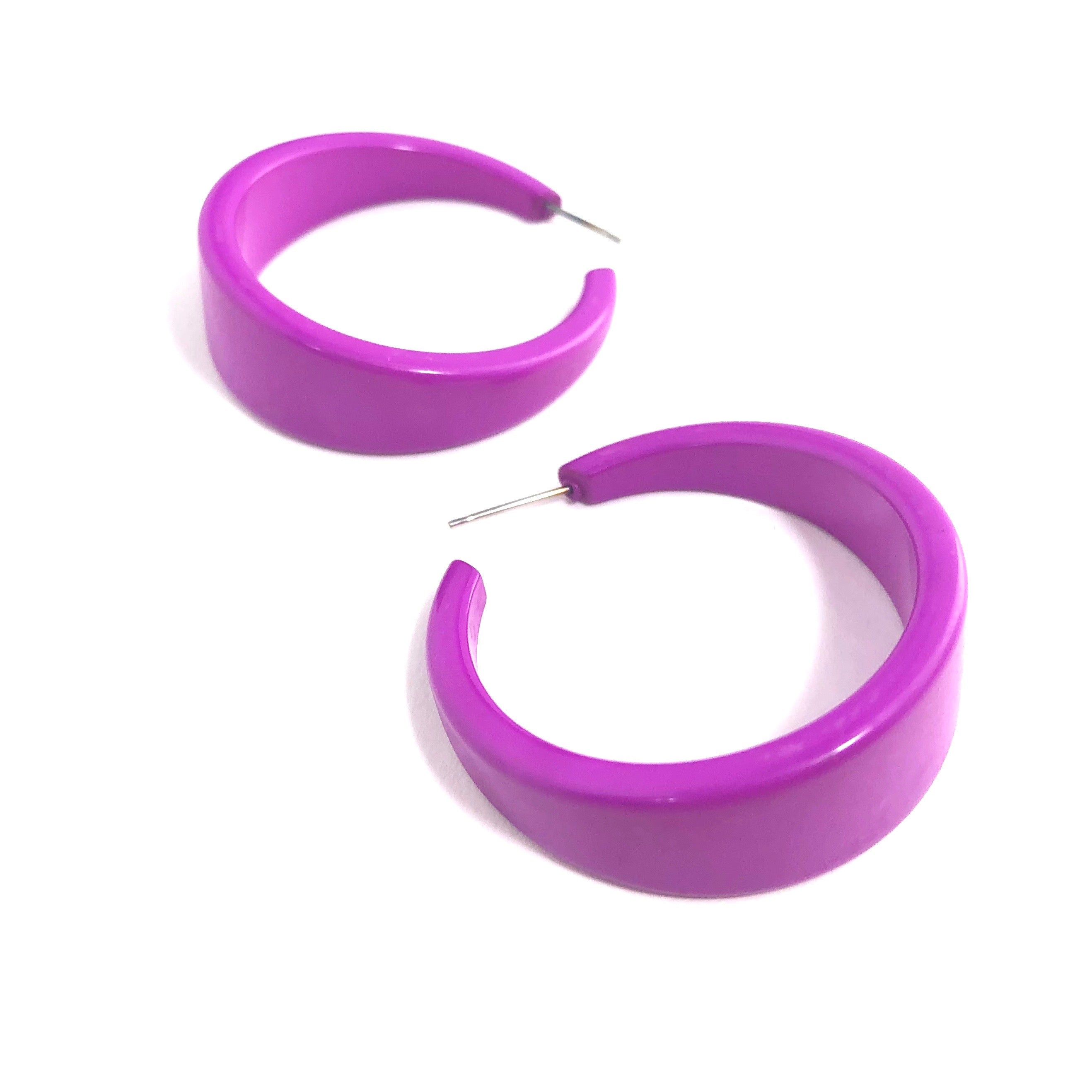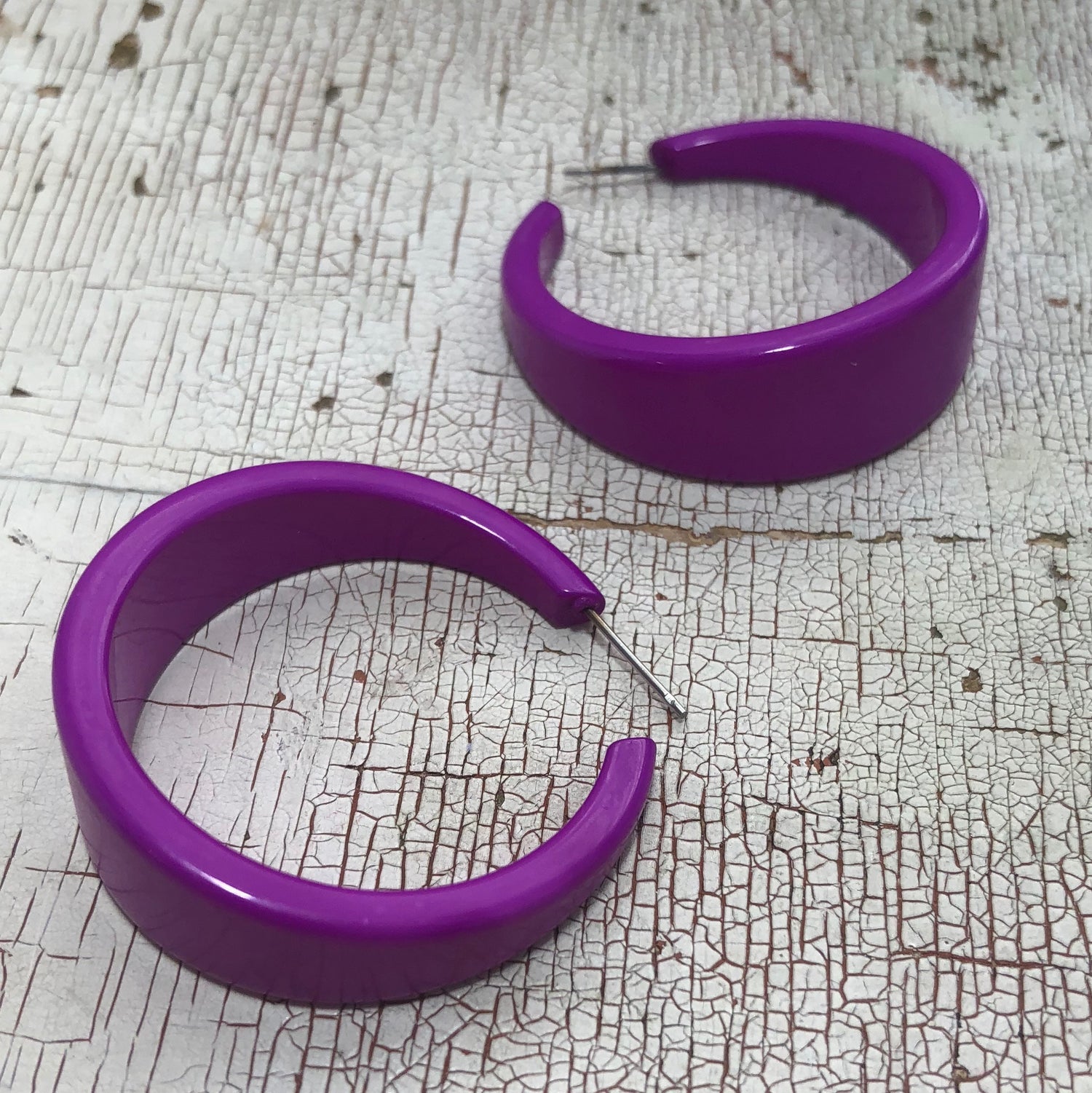 These hoop earrings made of vintage lucite in a shiny finish. The Emily Hoop is one of our most popular and largest styles. It's bold & lightweight, a great statement hoop earring.  Each measures 1.5" in diameter and about 1/2" at the widest. This style comes in lots of other luscious colors. Be sure to check out the rest of the earrings in the shop for other color options in this same style.