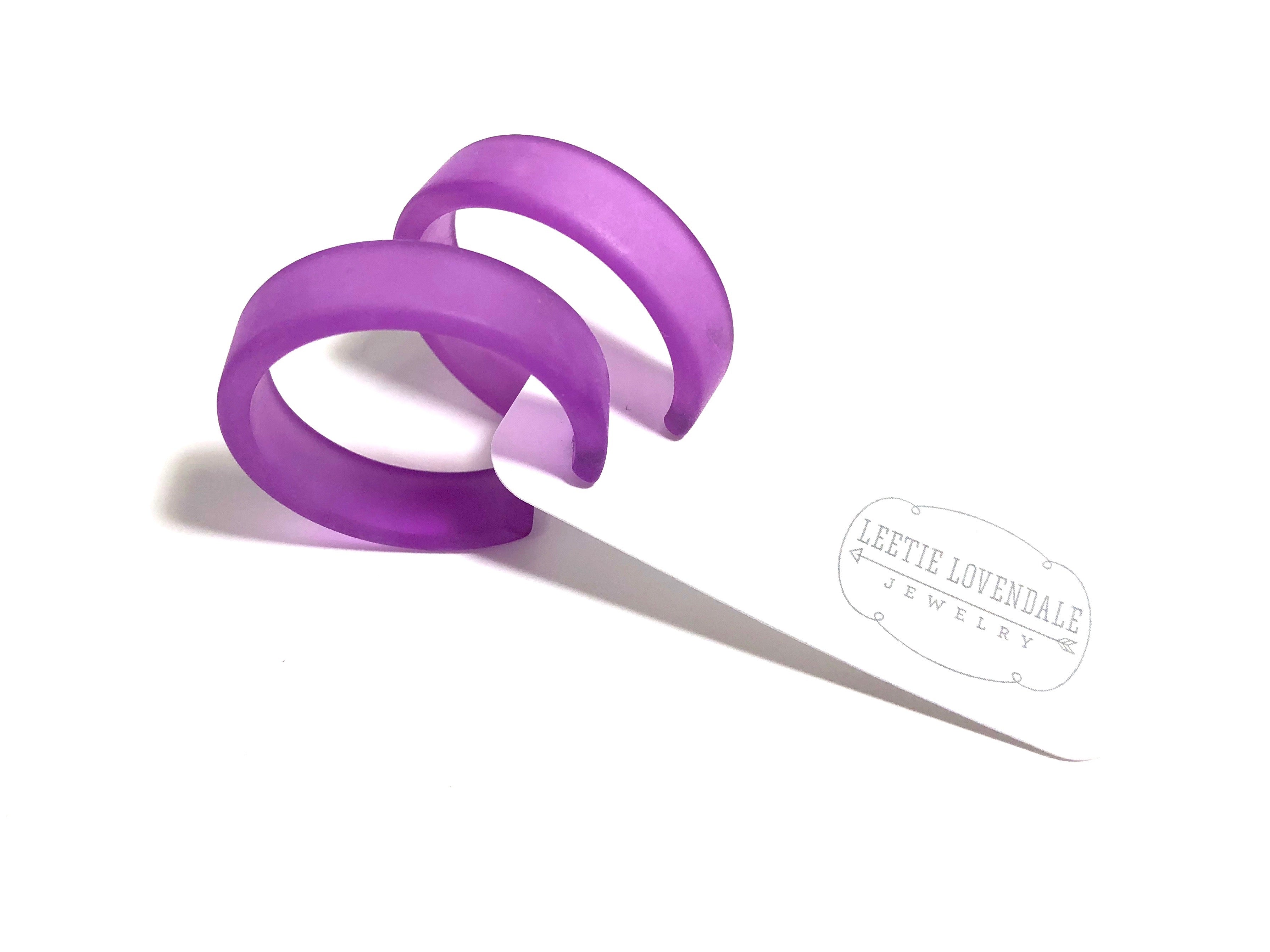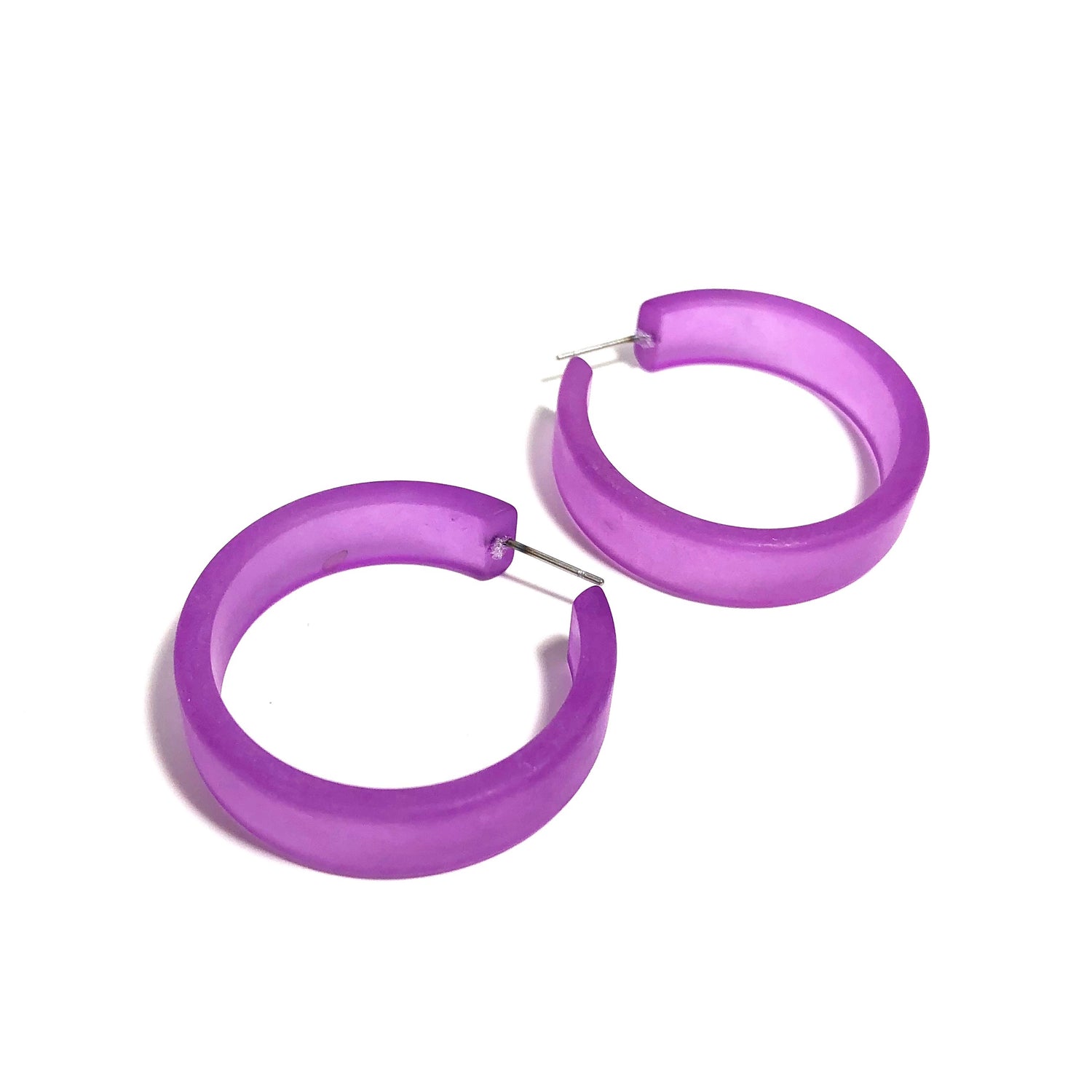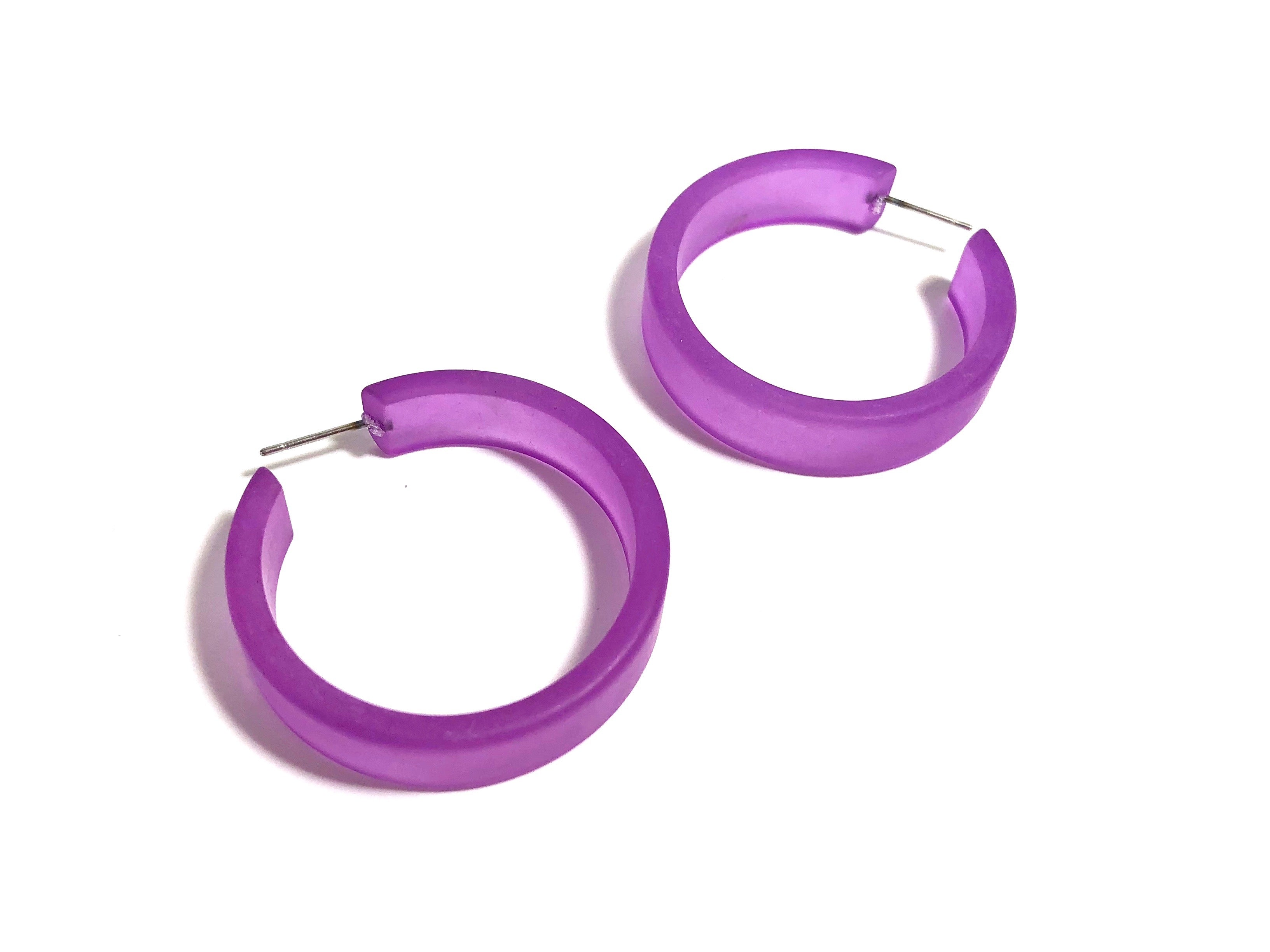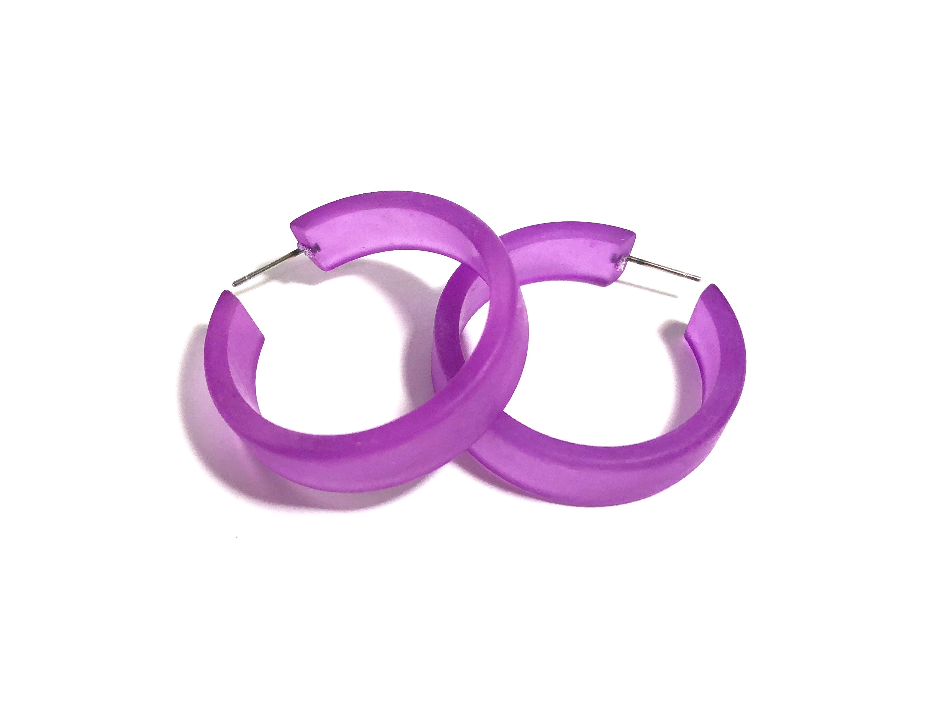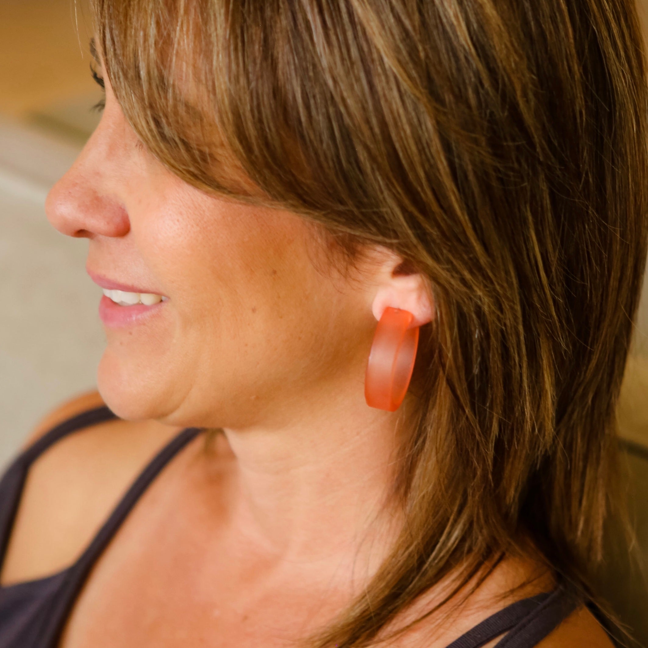 The Portland Hoop Earrings measure approximately 36mm and 10mm in width in diameter and width, respectively. This style, named after Portland, Maine – the maker's hometown – is one of our largest, yet it is still remarkably lightweight and comfortable to wear. These earrings come in lots of color options & a frosted finish. They are crafted and finished in the US, using vintage lucite parts from the 1960s-1980s from renowned manufacturers such as Best Plastics and Coro, Avon, and Haskell. The posts and backings of the earrings are made of sturdy surgical steel and acrylic.
