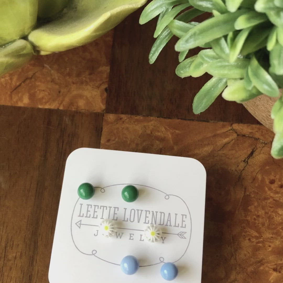 White Daisy Green & Turquoise Tiny Studs Earrings Set